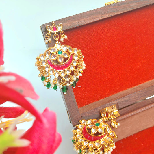 "RAVI"Gold Plated Kundan Studded Pearls Pink Beaded Chandbali Earrings