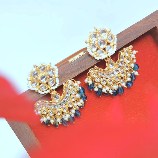 "PRIYA" Gold Plated Kundan studed Peacock Blue (Till Blue) Crystal Beaded Chandbali Earrings