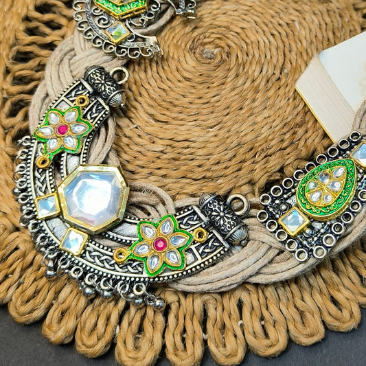BRASS & JUTE OXIDISED SILVER GREEN ENEMALAD STONTE STUDED CORCHET NECKLACEklace