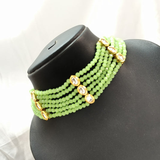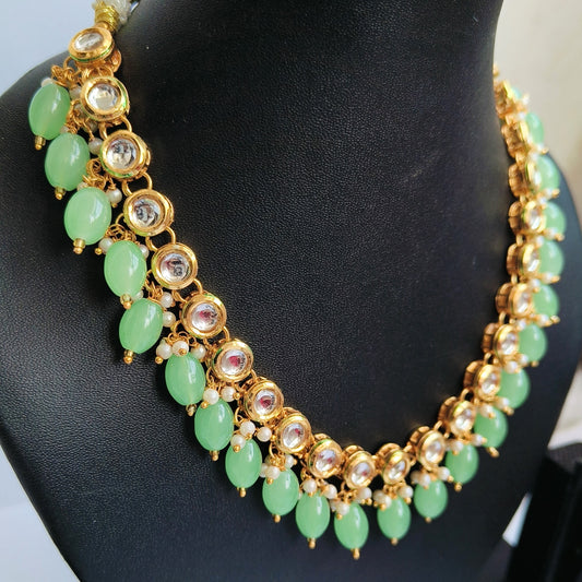 "PARTIKA" Gold Plated Kundan and Mint Crystal Beads Necklace Set
