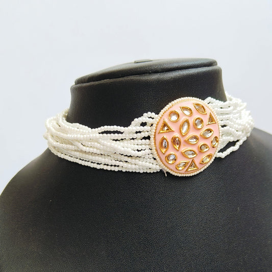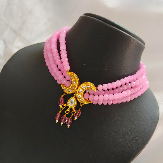 "GULABO" Gold Plated Chand Kundan studed Pink Crystal Beads Necklace Set