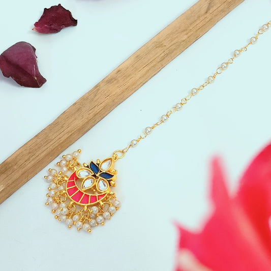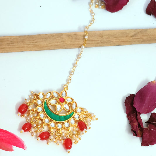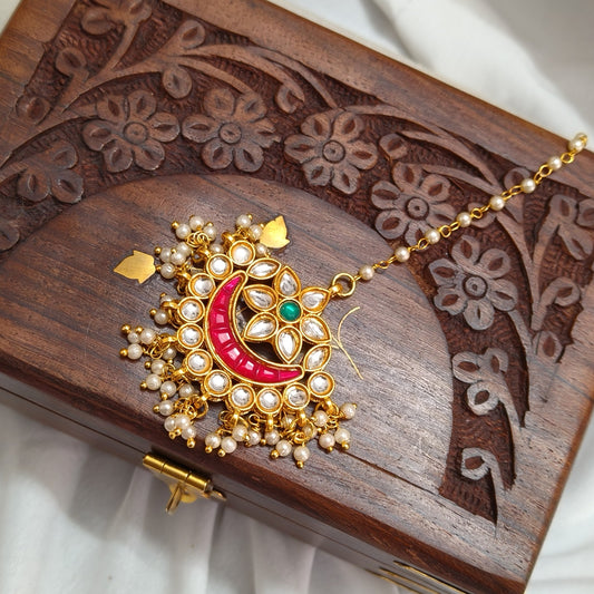 "ANSIKA" Gold Plated Rubi Kundan chand mangtikka With Pearls