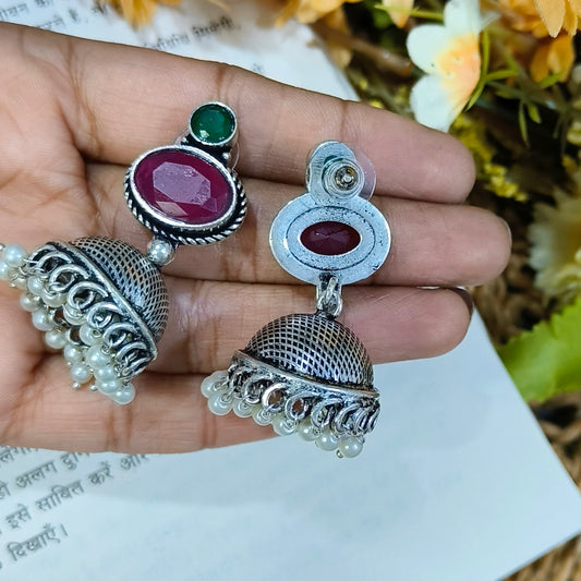 MONALISA STONE BRASS OXIDSED SILVER JHUMKA EARRINGS