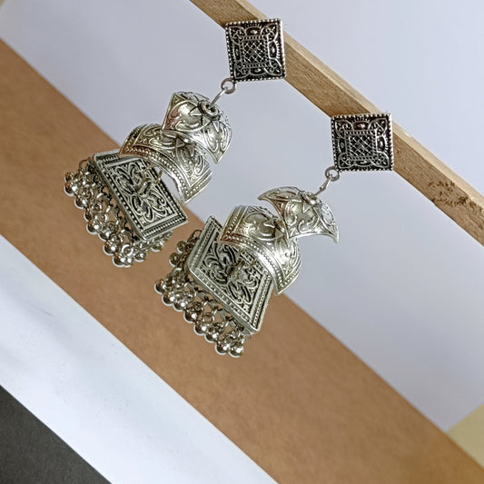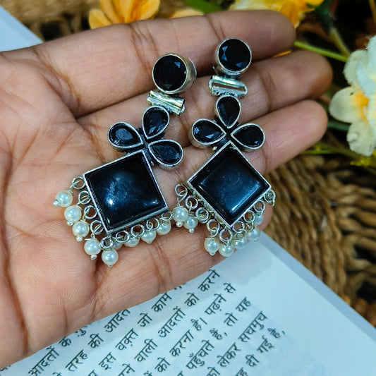 SEQURE SHAPE STONE AND PEARL GERMAN SILVER OXIDESED EARRINGS