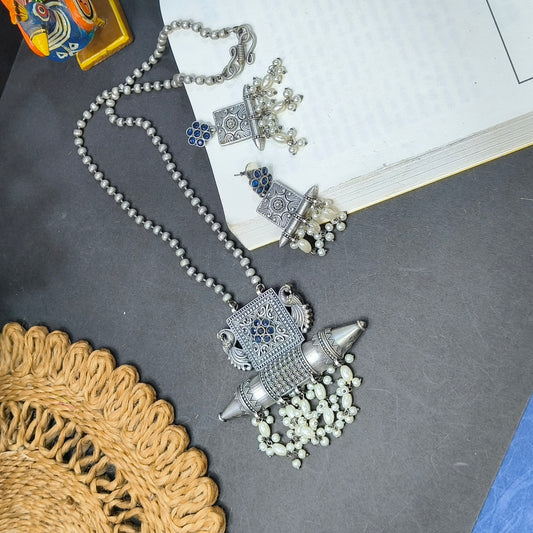 BIG GERMAN SILVER OXIDISED PENDANT LONG NECKLACE SET