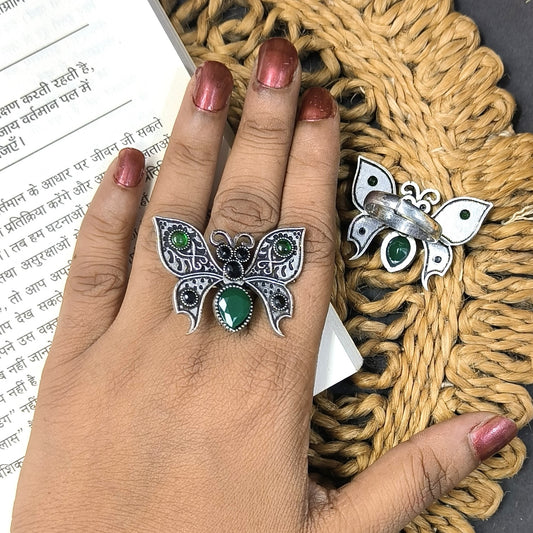 GREEN BUTTERFLY OXIDISED SILVER LOOKLIKE ADJUSTABLE FINGER RINGS