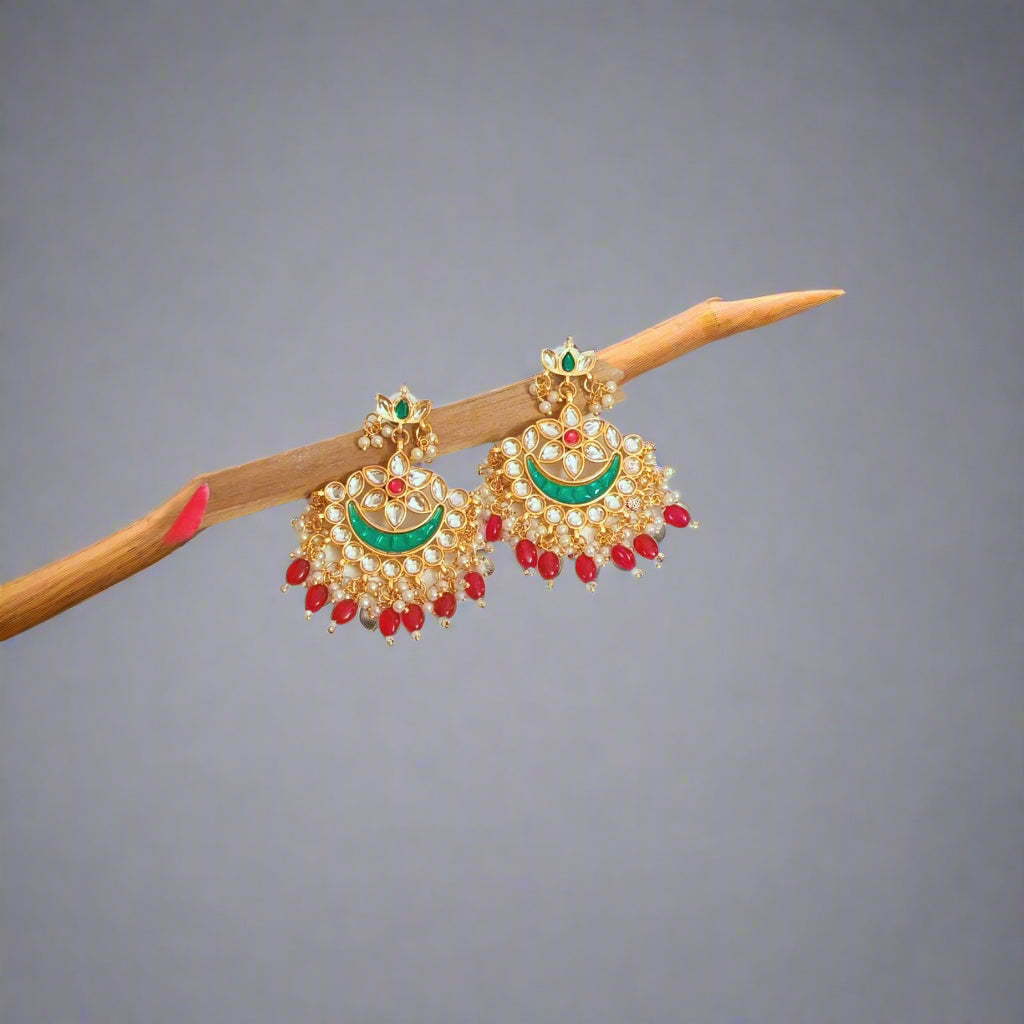 Elevate your wedding look with our exquisite "ANVIKA" Gold Plated Emerald & Rubi Stone Studded Rubi Beaded KUNDAN CHANDBALI EARRINGS. Traditional Indian craftsmanship meets modern design for a versatile and elegant addition to any wardrobe. This gold Chandbali Kundan earring set is perfect for weddings and special occasions.