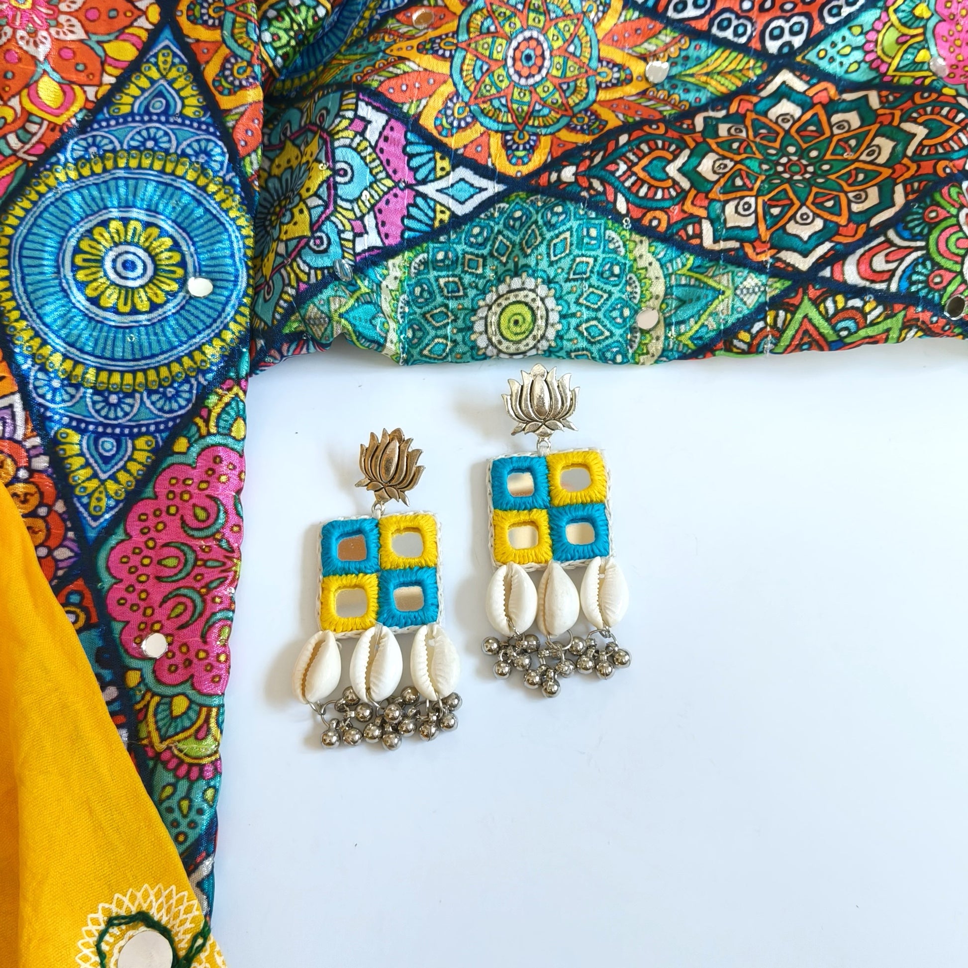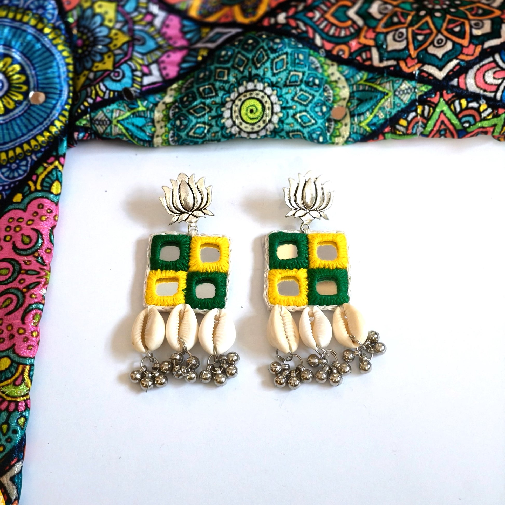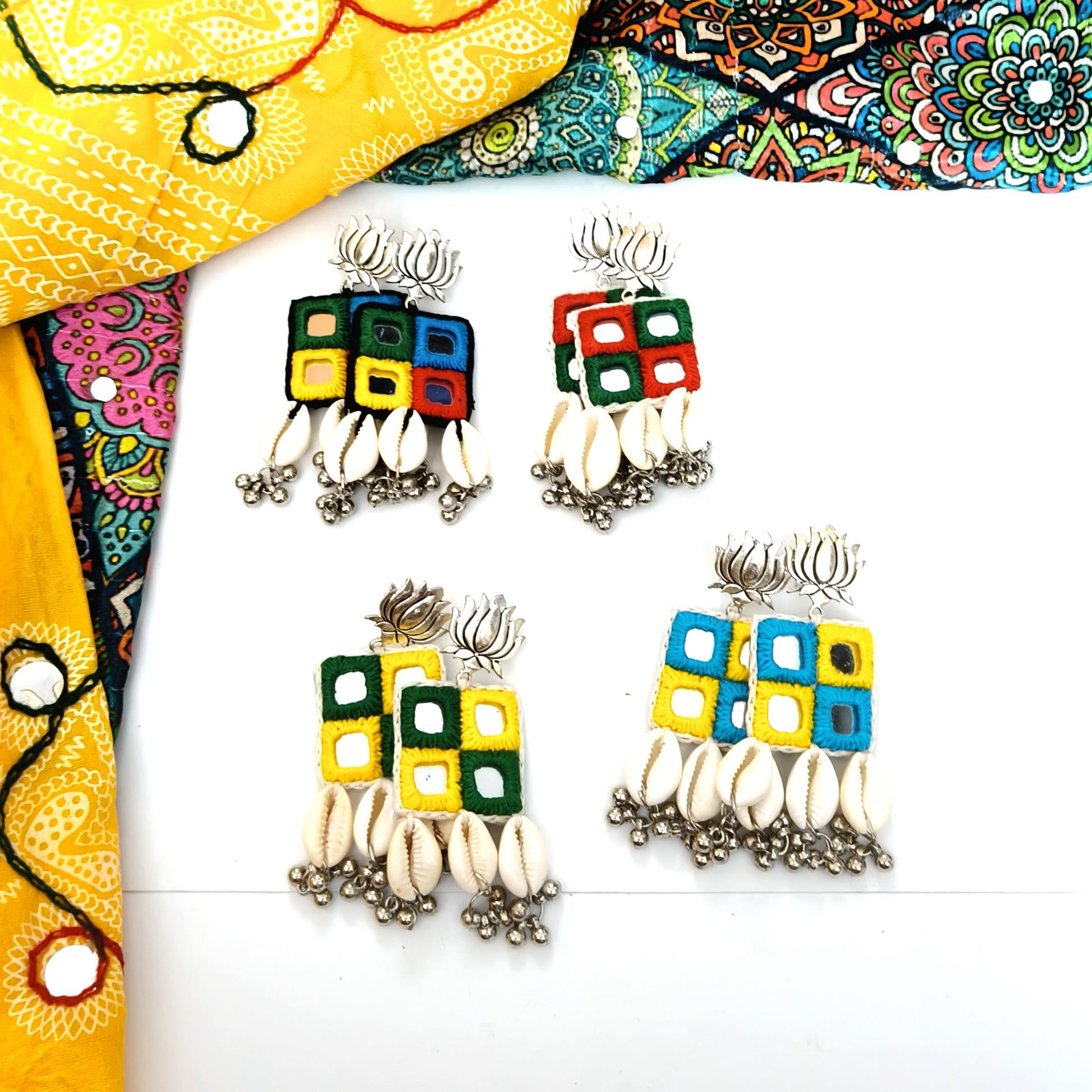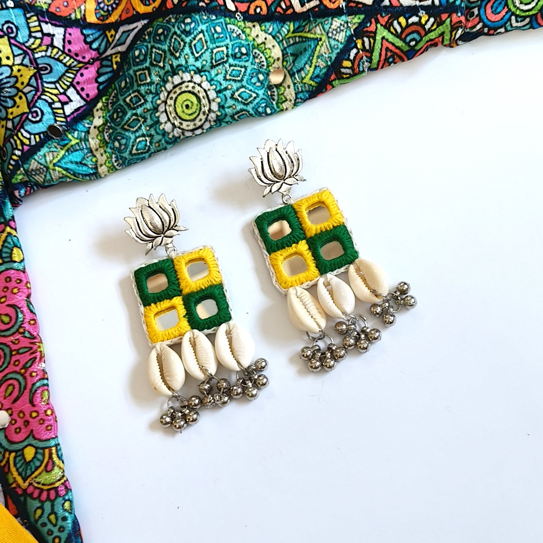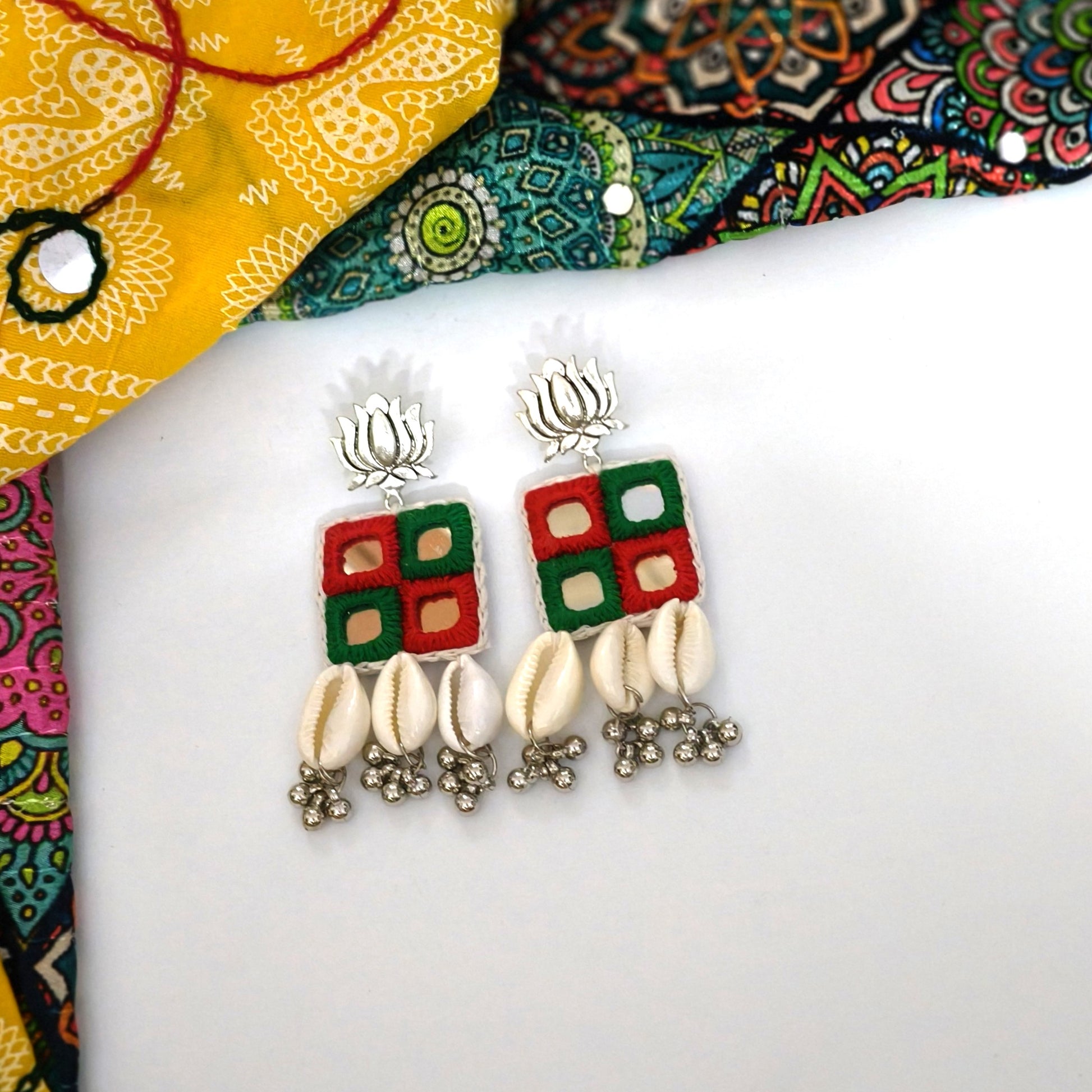 Step out with a pop of culture and style in our SHESHA 4 MIRROR SHELL HANGING EARRINGS! These stunning earrings showcase intricate mirror work, a centuries-old tradition in the vibrant Gujarat state. Embrace the Bohemian, ethnic, Navratri or any festive look with these statement earrings. Spice up your casual ensemble with these beauties